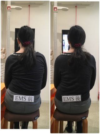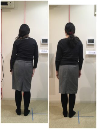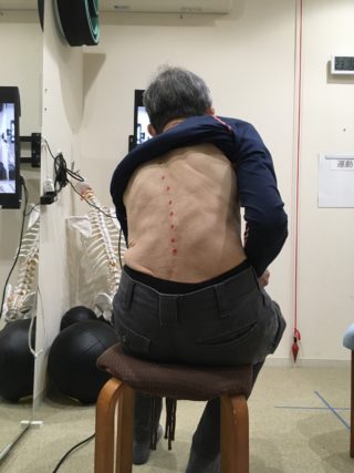 70代女性(京都市)もともと15°の側弯をお持ちでしたが、ここ2年の間にカーブが急激に進行し来院されました。(来院時60°)お話を伺うと5年前に脳出血をされておられました。脳出血の跡はMRIで右脳中心に確認され、左手の握力や、左脚の力が入りにくくなっておられました。左半身の筋力低下によってまっすぐに姿勢を保つことができなくなっていると考えました。治療ではまず真っすぐ座り、立つにはどこに力を入れるとよいのかをモニターでご自分の背中を見ながら覚えていただきました。その意識で1週間過ごしていただいた後の姿勢が真ん中の写真です。その後EMSによって働きにくくなっている筋肉を動かすことによってさらに姿勢が改善いたしました(写真右)。動かしやすい右方向に無意識で体を動かすと姿勢が倒れる方向に戻ってゆきますので、ひじ掛けは左を使う等、動かしにくい左方向へ体を動かすよう意識していただいています。